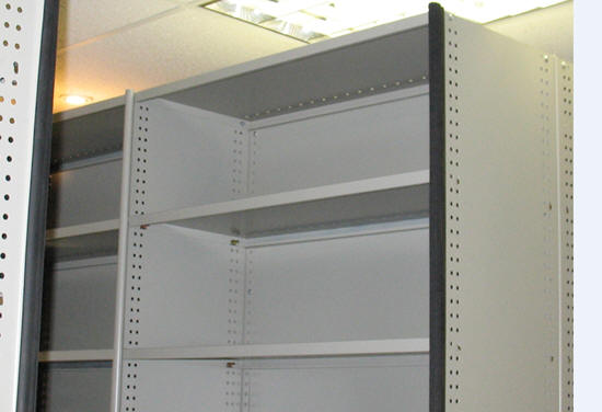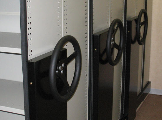 Mobile shelving is created by fixing back to back bays of office shelving to moveable bases which run on floor mounted rails. Just one aisle is necessary in an installation. Base units may be moved manually or mechanically to create an aisle where required.