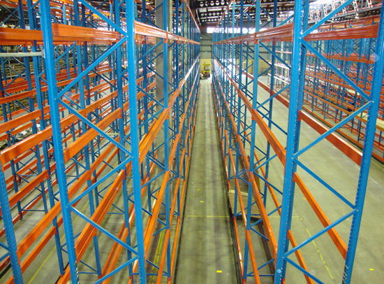 This optimizes the use of floor area and height, whilst permitting individual access to all pallets. Specialized handling equipment is required to operate in the narrow aisles between the racks.